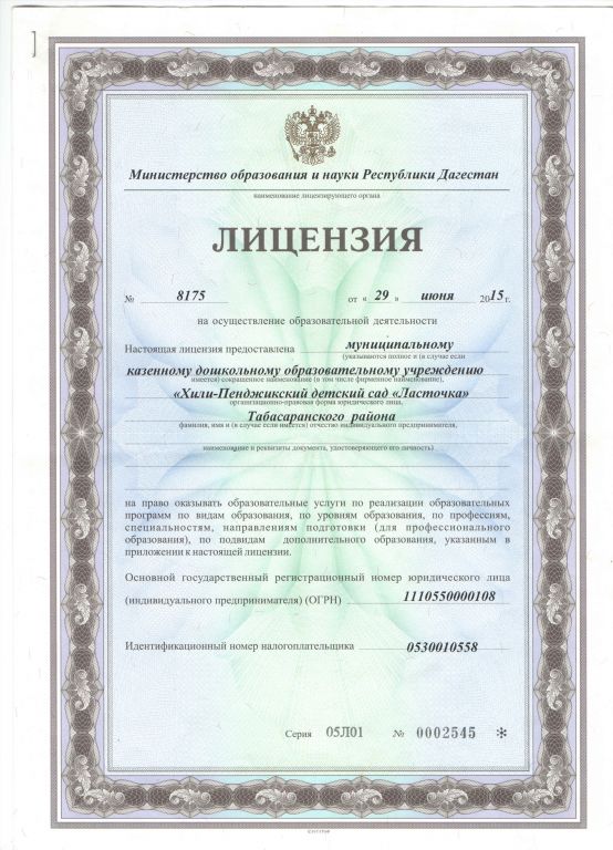 | Полное наименование образовательной организации* | Муниципальное казенное дошкольное образовательное учреждение "Хили-Пенджикский детский сад"Ласточка" |