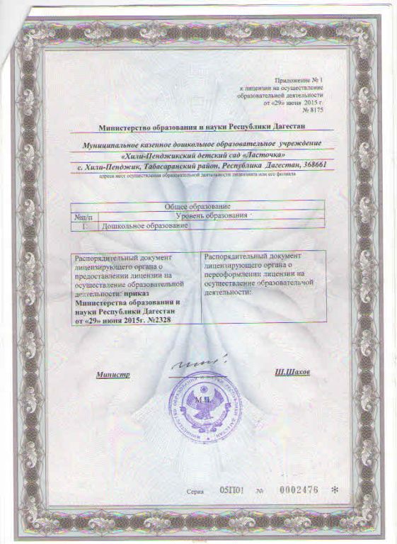 | Сокращенное наименование образовательной организации* | МКДОУ «Хили-Пенджикский д/с «Ласточка» |