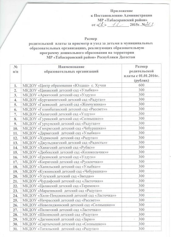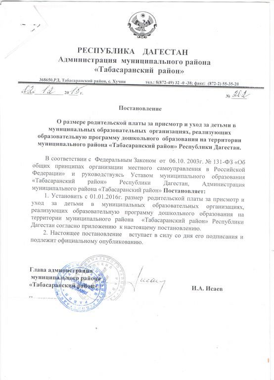 Документ об установлении размера платы, взимаемой с родителей (законных представителей)